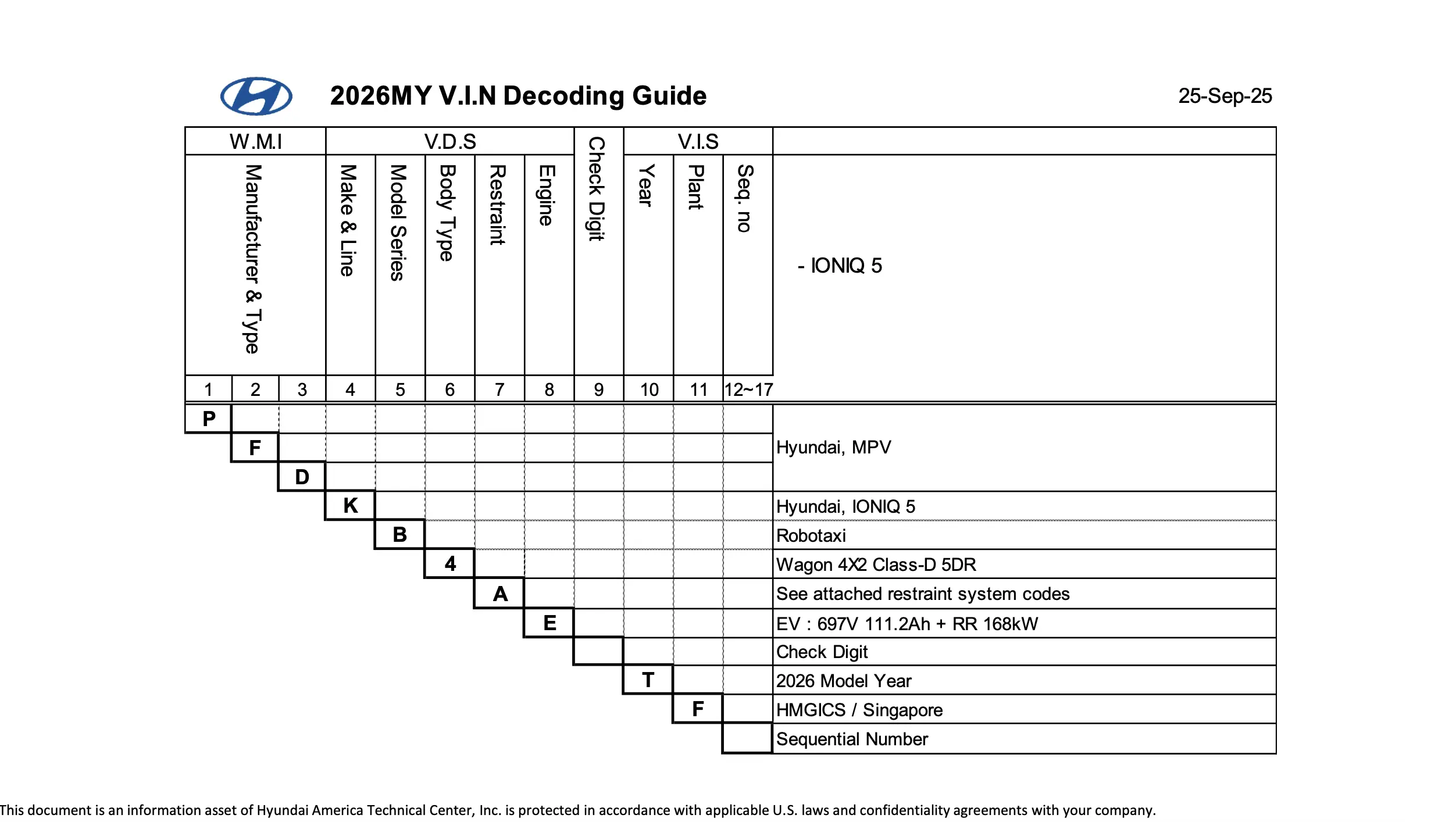 Source: 2026MY V.I.N Decoding Guide submitted to NHTSA by Hyundai America Technical Center, Inc., dated September 26, 2025.